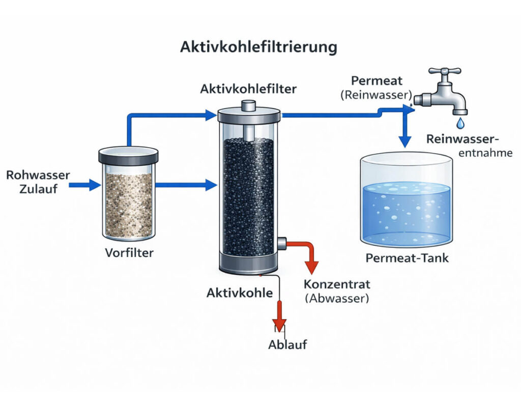 • Wasser fließt durch Poren aus Aktivkohle